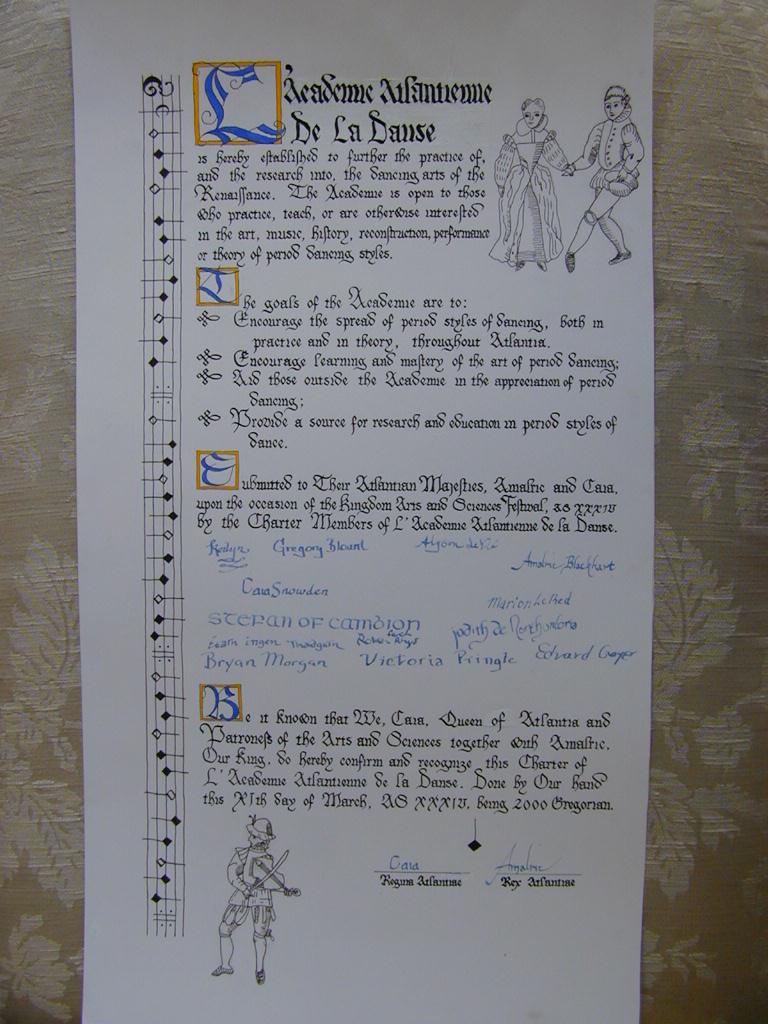 Be it known that We, Caia, Queen of Atlantia and Patroness of the Arts and Sciences, along with Amalric, Our King, do hereby confirm and recognize this Charter of L’Academie Atlantienne de la Danse, and duly establish it as a Guild of Atlantia. Done by Our hand this XIth day of March, A.S. XXXIV, being 2000 Gregorian,